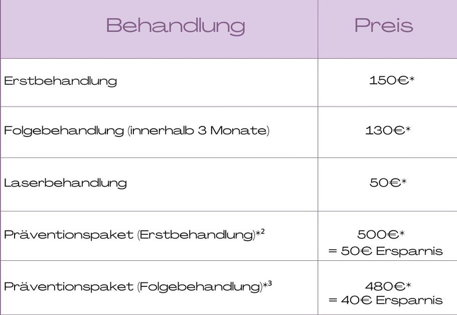* Zahlungshinweis für Pakete: Du zahlst ganz bequem pro Termin den regulären Preis. Der komplette Rabatt (40 € bzw. 50 €) wird dir bei der 4. Behandlung gutgeschrieben.