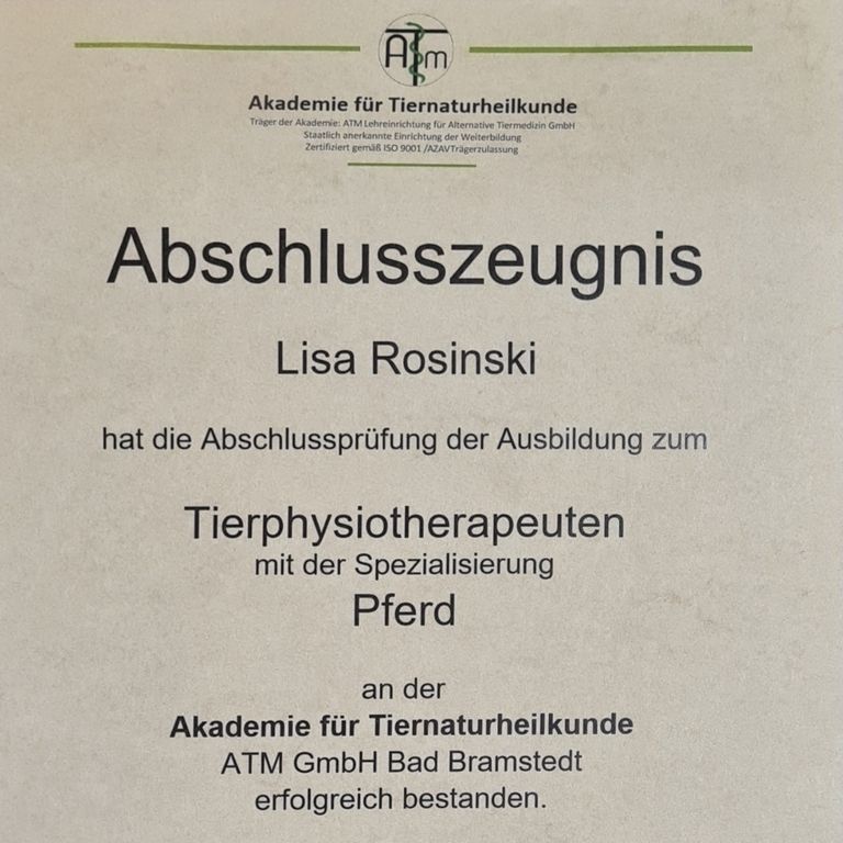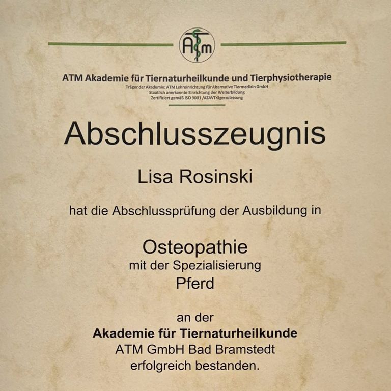 Diese Erfahrung motivierte mich, eine professionelle Ausbildung zu beginnen. Ich schloss erfolgreich die Ausbildung zur Pferdephysiotherapeutin an der ATM ab und erwarb währenddessen Kenntnisse in Phytotherapie und Akupunktur. Anschließend absolvierte ich die Ausbildung zur Chiropraktikerin für Pferde und bin zudem zertifizierte Tape4Fur-Therapeutin. 2024 schloss ich meine Ausbildung in Osteopathie für Pferde ab, in der ich die Bereiche craniosacrale, fasziale und viszerale Osteopathie erlernte – Techniken, die Bewegungsapparat, Gelenke, Faszien und innere Organe sanft mobilisieren, die Körperbalance fördern und die Selbstheilungskräfte der Pferde aktiv unterstützen.